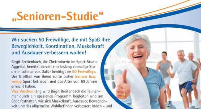 „Senioren-Studie 2018“ Für unsere neue Senioren-Studie suchen wir suchen 50 Freiwillige, die mit Spaß ihre Beweglichkeit, Koordination, Muskelkraft und Ausdauer verbessern wollen! Mit dieser Studie haben Sie die Möglichkeit, das Sport-Studio Aggertal Unverbindlich und ohne Vertragsbindung kennen zu lernen. Die Teilnehmerzahl ist auf 50 Probanden begrenzt. Jetzt schnell unter 02246-6959 einen Termin für ein kostenloses…