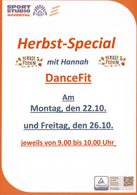 Herbst-Special mit Hannah im Sport-Studio Aggertal In den Herbstferien findet am Monatag, den 22.10.2018 sowie am Freitag, den 26.10.2018 jeweils von 09:00 Uhr bis 10:00 Uhr der Herbst-Special Kurs DanceFit mit unserer Hannah statt. DanceFit ist ein effektives Ganzkörpertraining, das alle Muskelpartien stärkt und die Fettpolster schmelzen lässt. Die rhythmischen Dance Moves fördern außerdem die…