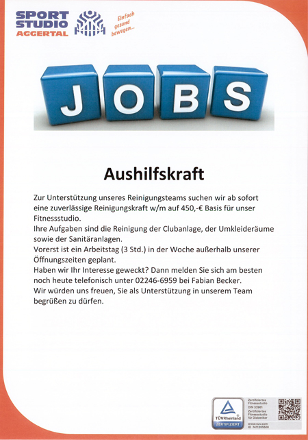 Stellenangebot Zur Unterstützung unseres Reinigungsteams suchen wir ab sofort eine zuverlässige Reinigungskraft w/m auf 450,-€ Basis für unser Fitnessstudio. Ihre Aufgaben sind die Reinigung der Clubanlage, der Umkleideräume sowie der Sanitäranlagen. Vorerst ist ein Arbeitstag (3 Std.) in der Woche außerhalb unserer Öffnungszeiten geplant. Haben wir Ihr Interesse geweckt? Dann melden Sie sich am besten…