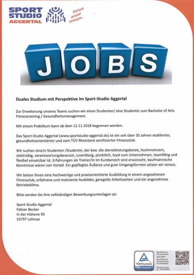Duales Studium mit Perspektive im Sport-Studio Aggertal Zur Erweiterung unseres Teams suchen wir einen Studenten/ eine Studentin zum Bachelor of Arts Fitnesstraining / Gesundheitsmanagement. Mit einem Praktikum kann ab dem 12.11.2018 begonnen werden. Das Sport-Studio Aggertal (www.sportstudio-aggertal.de) ist ein seit über 35 Jahren etablierter, gesundheitsorientierter und vom TÜV Rheinland zertifizierter Fitnessclub. Wir suchen eine/n Studenten…