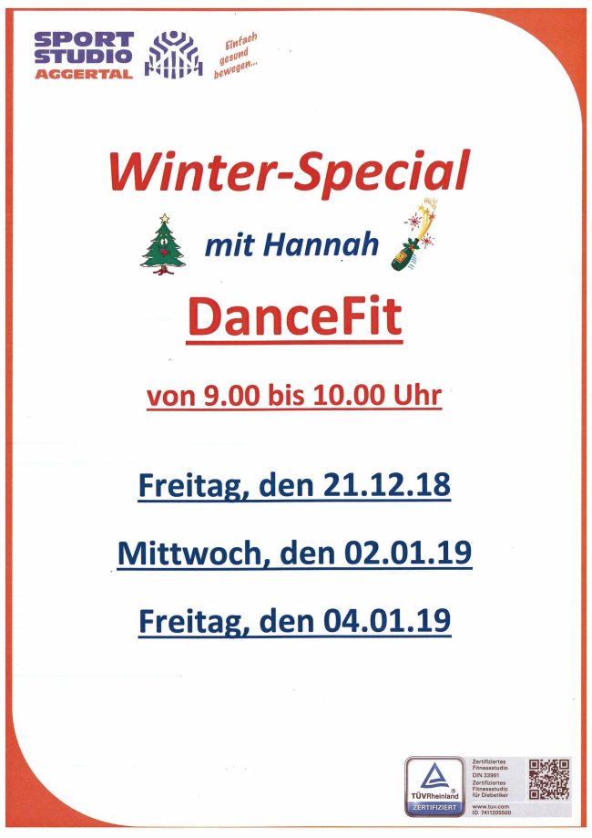 Winter-Special mit Hannah im Sport-Studio Aggertal In den Weihnachtstferien findet am Freitag, den 21.12.2018, am Mittwoch, den 02.01.2019 sowie am Freitag, den 04.01.2019 jeweils von 09:00 Uhr bis 10:00 Uhr der Winter-Special Kurs DanceFit mit unserer Hannah statt. DanceFit ist ein effektives Ganzkörpertraining, das alle Muskelpartien stärkt und die Fettpolster schmelzen lässt. Die rhythmischen Dance…