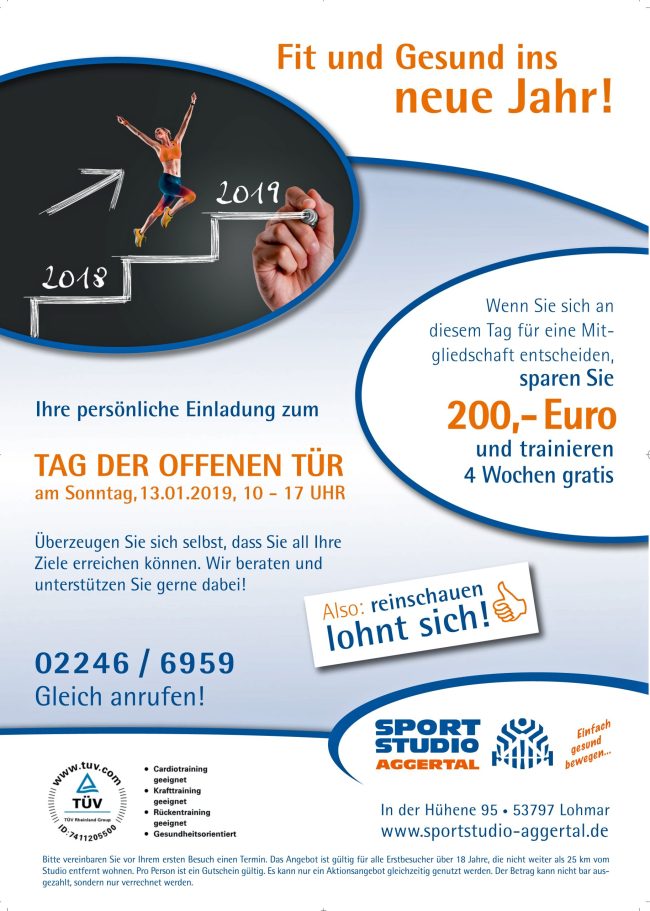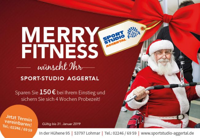 Merry Fitness „Merry Fitness“ heißt es diesen Dezember im Sport-Studio Aggertal. Für alle Sport-Interessierten und Sport-Begeisterten, die uns noch nicht kennen, haben wir passend zur Weihnachtszeit, wertvolle Gutscheine bereit gelegt. Jeder Gast, der sich während der „Merry Fitness“ Aktion bis einschließlich 31.01.2019 bei uns anmeldet, spart satte 150,-€ bei seinem Startpaket. Also, noch schnell mit…